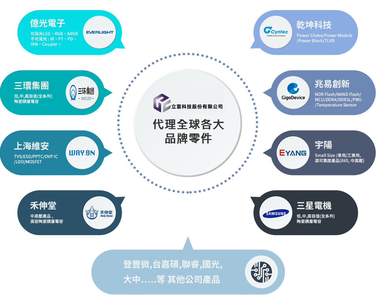 成立于2003年,立寰科技股份有限公司总部设在台湾新北市中和区,并在深圳、苏州和新加坡设有销售办事处。我们专注于分销主动和被动电子元件,提供来自超过20家世界级制造商的全面产品组合,包括乾坤科技、三环集团、兆易创新、登丰微、亿光、劲达国际、维安、宇阳、 禾伸堂、三星MLCC、联睿等。我们的广泛产品范围适用于包括3C、物联网、工业电子、汽车电子和医疗器械等各行各业,为客户提供无缝集成的电子元件解决方案。