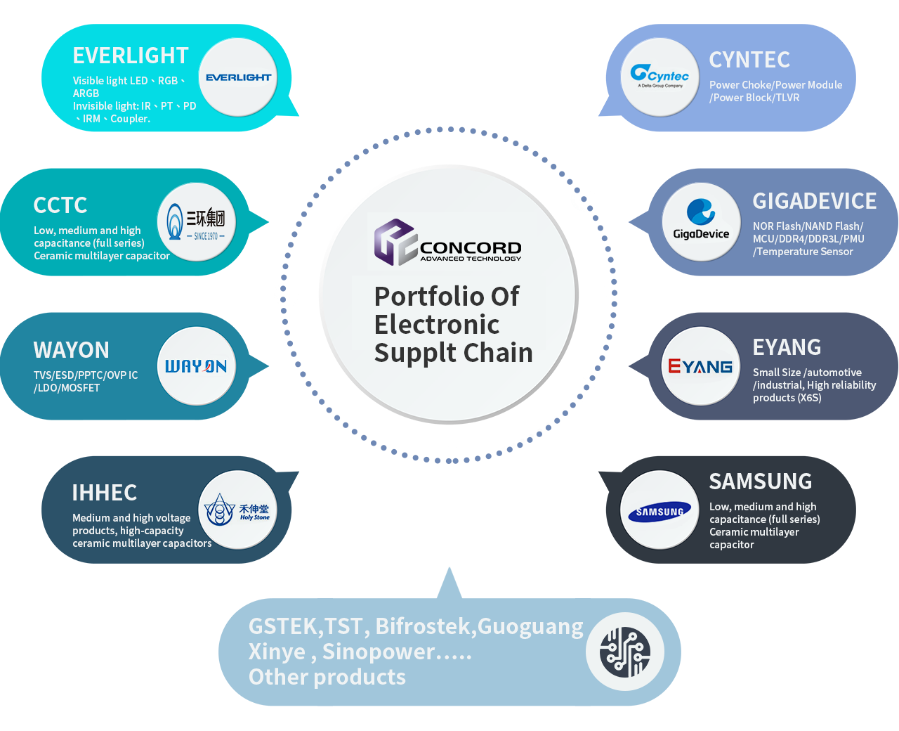 Concord Advanced Technology is headquartered in Zhonghe District, New Taipei City, Taiwan, with sales offices located in Shenzhen, Suzhou, and Singapore. We specialize in the distribution of both active and passive electronic components, offering a comprehensive portfolio of products from over 20 world-class manufacturers, including Cyntec, CCTC, GigaDevice, GStek, Everlight, Raytac BLE Module, Wayon, EYANG, IHHEC,Samsung(MLCC), Bifrostek and more. Our wide range of products caters to various industries including 3C, IoT, industrial electronics, automotive electronics, and medical devices, offering customers seamless and integrated electronic component solutions.